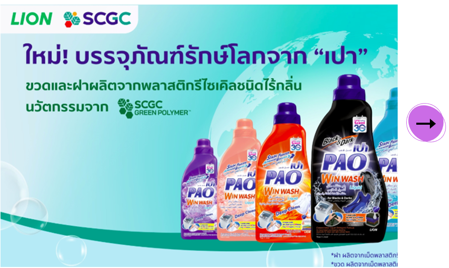 SCGC, a leading integrated polymer business committed to sustainability, together with Lion (Thailand) Co., Ltd., has launched environmentally friendly packaging for “PAO” liquid laundry detergent. Both the bottle and cap are made from high-quality, odorless post-consumer recycled (PCR) resin developed through SCGC GREEN POLYMER innovation and certified under the Global Recycled Standard (GRS), ensuring traceability of recycled material sources.