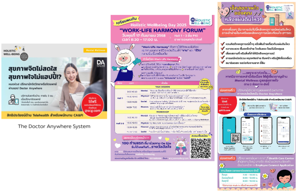 การบริหารสุุขภาวะที่ดีทางใจ (Workplace stress management) เอสซีจีคำนึงถึงการมีสุขภาวะที่ดีทางใจของพนักงาน มุ่งป้องกันและบรรเทาภาวะความเครียดที่อาจเกิดขึ้นทั้งจากในงานและนอกงาน จึงจัดให้มีระบบ Caring Check ที่พนักงานสามารถสอบถาม เปิดเผย หรือแลกเปลี่่ยนข้อมููลอันเกี่ยวกับสภาวะทางจิตใจของตนเอง ระบบ Doctor Anywhere ที่พนักงานสามารถเข้ารับการให้คำปรึกษาจากจิตแพทย์ และนักจิตวิทยาผ่านทางออนไลน์ และยังจัดให้มีจิตแพทย์ประจำศูนย์ดูแลสุขภาพพนักงาน (Health Care Center) เพื่อให้พนักงานสามารถนัดหมายเข้าพบ กิจกรรม ‘สติ Space’ เพื่อพัฒนาการฟังอย่างมีสติและส่งเสริมสุขภาวะทางจิตใจ