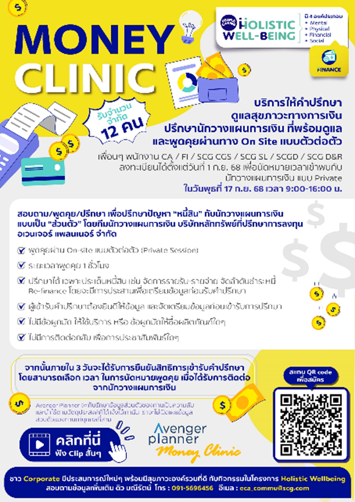 Money Clinic: ให้ความรู้ และให้คำปรึกษาพนักงานด้านการเงินแบบตัวต่อตัวกับนักวางแผนการเงิน เพื่อปรึกษาปัญหาหนี้สิน เช่น การจัดการรายรับ-รายจ่าย จัดลำดับชำระหนี้ หรือการ Re-finance