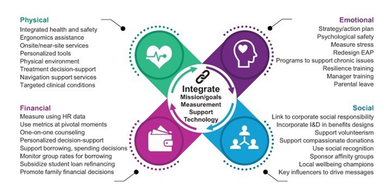 การส่งเสริมสุขภาวะที่ดีของพนักงาน ซึ่งครอบคลุม 4 มิติสำคัญ ได้แก่ ร่างกาย จิตใจ การเงิน และสังคม โดยมีการให้ความรู้ ให้คำปรึกษาด้านการเงิน ด้านสุขภาพ รวมถึงสุขภาพด้านจิตใจ การให้ความรู้ แลกเปลี่ยนความคิดเห็นและกิจกรรมอื่น ๆ ในด้านสังคม ดังนี้